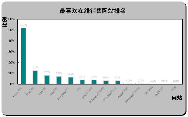 在選擇易趣中國作為最不喜歡在線銷售網站的被調查者原因中,很大一部分被調查者認為易趣中國操作不便利,網頁設計不友好,而且東西種類有限。另外,很多用戶對易趣的安全性和信任度也頗有微詞。