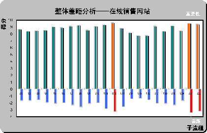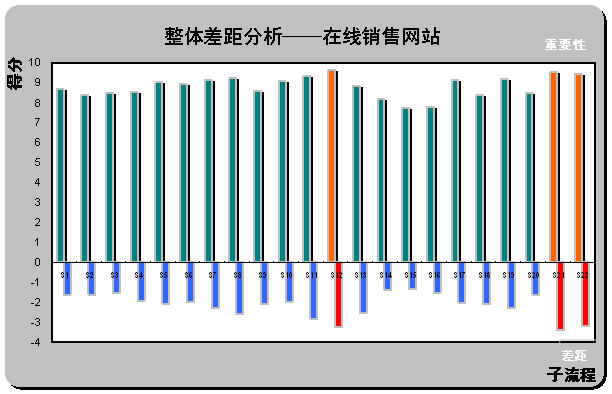 。2)整體差距分析(Gap Analysis)。請見上圖X軸下方所示,計算所有被調查對所列在線銷售網站的滿意度平均值(綜合最喜歡在線銷售網站和最不喜歡在線銷售網站的滿意度,計算被調查者對22個子流程的滿意度評分)。通過計算重要性和滿意度的差距,首先,一個有趣的現象,在著色的三個差距最大的子流程剛好也是重要性得分排名前三位的流程S12,