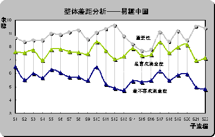 1) 兩條滿意度曲線走向一致。如上圖中選擇易趣中國作為最喜歡在線銷售網站和最不喜歡在線網站的被調查者的滿意度曲線可以發(fā)現,兩條體驗曲線的走向基本一致,有幾乎相同的“峰”和“谷”。