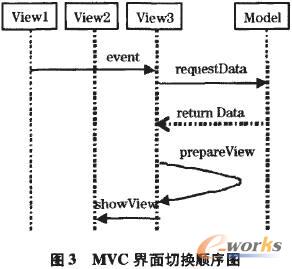 在界面設(shè)計(jì)上,使用MVC模式。MVC模式包括三類對(duì)象,模型Model是應(yīng)媚對(duì)象,視圖View是它在屏幕上的表示,控制器定義了用戶輸入的響應(yīng)方式。MVC架構(gòu)使表現(xiàn)與邏輯分開,使得多個(gè)視圖可以共用同一個(gè)MVC模型。MVC界面切換順序圖如圖3。