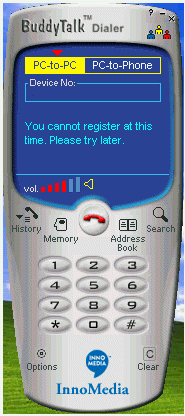 。ㄈ鐖D3),這個(gè)就是BuddyTalk的軟件界面。這象不象一個(gè)手機(jī)?上面的藍(lán)色部分是液晶屏。你可以選擇pc-to-pc或者pc-to-phone,下面是用來輸入電話號(hào)碼的一個(gè)空框,空框下面的部分是軟件顯示提示信息的,再下面是音量大小的顯示器。液晶屏的下面部分跟手機(jī)幾乎一樣,其中一個(gè)“search”,這是用來上網(wǎng)實(shí)現(xiàn)全球用戶數(shù)據(jù)庫搜索,一個(gè)“options”,各種設(shè)置可以在這里完成,“Memory”記錄的是你通話信息,以利快速撥號(hào)。