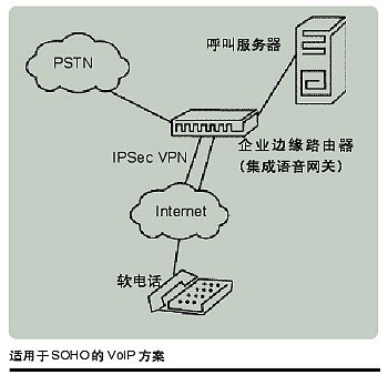 。。通常,為了安全性的考慮,SOHO用戶會通過企業(yè)數(shù)據(jù)網(wǎng)絡(luò)的IPsec VPN連接來訪問企業(yè)內(nèi)部的呼叫控制服務(wù)器。被叫方為企業(yè)內(nèi)部的呼叫通過IPsec VPN轉(zhuǎn)到內(nèi)部網(wǎng)絡(luò),被叫方為企業(yè)外部的呼叫則轉(zhuǎn)到PSTN網(wǎng)絡(luò)。大多數(shù)情況下,呼叫控制服務(wù)器都是布置于企業(yè)總部或大型分支站點,但近來的一個趨勢是企業(yè)可以選擇將此類服務(wù)外包給運營商。