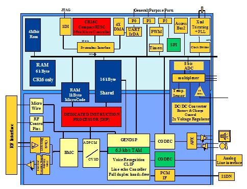 例如,SC14438是一個(gè)優(yōu)化了的CMOS芯片,能夠進(jìn)行DECT(1.9GHz)內(nèi)或2.4GHz ISM數(shù)字頻帶手機(jī)內(nèi)需要的所有音頻、信號(hào)及數(shù)據(jù)處理。一個(gè)ADPCM代碼轉(zhuǎn)換器,一個(gè)低功耗的編解碼器(CODEC)及模擬前端被集成于該芯片中,提供麥克風(fēng)與(動(dòng)態(tài)的)揚(yáng)聲器之間直接的連接。同時(shí)還整合了雙工免提操作。SC14438的設(shè)計(jì)適用于任一無線產(chǎn)品設(shè)計(jì)。一個(gè)專用的TDMA控制器能夠處理所有的物理層時(shí)隙和無線控制。美國(guó)國(guó)家半導(dǎo)體公司的標(biāo)準(zhǔn)小型RISC