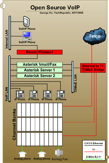 TDMoE(基于以太網(wǎng)的時(shí)分復(fù)用)LAN段負(fù)責(zé)PBX-語音郵箱和PBX-信道處理單元的通信。在過去,這些設(shè)備間的TDM通信使用昂貴的T1卡,但是通過將TDM通信搬到廉價(jià)的以太網(wǎng)上,這一點(diǎn)已經(jīng)得到極大的改善。