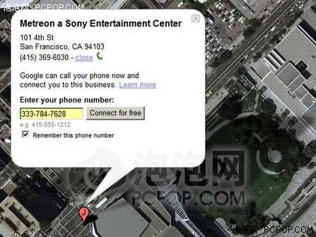 用戶在Google地圖上地位到某個(gè)商業(yè)機(jī)構(gòu)后,可以得到該機(jī)構(gòu)的電話號(hào)碼,當(dāng)用戶點(diǎn)擊搜索到機(jī)構(gòu)電話號(hào)碼旁邊的“呼叫”連接之后,系統(tǒng)會(huì)要求用戶輸入自己的電話號(hào)碼。用戶輸入完畢后點(diǎn)擊“免費(fèi)連接”按鈕,Google Maps就會(huì)呼叫用戶提供的號(hào)碼。自己的電話響起后,顯示的號(hào)碼不是Google的,而是所定位到機(jī)構(gòu)的電話。用戶接聽(tīng)電話后,或者因?yàn)镚oogle Maps會(huì)把用戶電話接通到定位到的機(jī)構(gòu)那里,所以用戶會(huì)聽(tīng)到與直接撥打該機(jī)構(gòu)電話相同的響聲,或者用戶會(huì)聽(tīng)到自動(dòng)的語(yǔ)音提示要求用戶輸入“1”后便能接通電話。