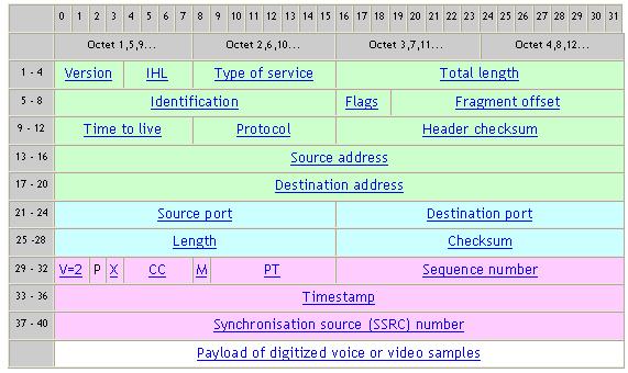 根據(jù)IETF的標準建議,通過IP網絡傳輸語音信號樣本需要增加三個額外的報頭,每個報頭對應一個網絡層次,即IP,UDP和RTP [4]。 IPv4的報頭長20個字節(jié)(8bit),UDP報頭為8字節(jié),RTP報頭為12字節(jié)。圖2所示為語音信號的封裝格式。