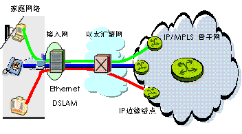 圖4所示為支持三重播放(Triple Play)業(yè)務的城域網架構。在城域網架構中,一般包括接入復用器(DSLAM)和IP邊緣路由器兩個層次;接入復用器連接多個家庭網絡,IP邊緣路由器是連接核心網的入口。在用戶密度較高的區(qū)域,城域網DSLAM和邊緣路由器之間通常還包括流量匯聚設備,現(xiàn)階段Ethernet是被廣泛認可的高速匯聚技術。DSLAM和匯聚結點的上連鏈路通常采用GE和10GE接口。