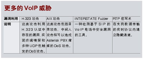 研究人員宣布了針對(duì)VoIP信令協(xié)議H.323和AIX的工具,以及將音頻插入到VoIP呼叫中的工具。其中,一款自動(dòng)探測會(huì)話發(fā)起協(xié)議安全漏洞的工具被認(rèn)為能夠在VoIP傳輸流上搭載數(shù)據(jù)。