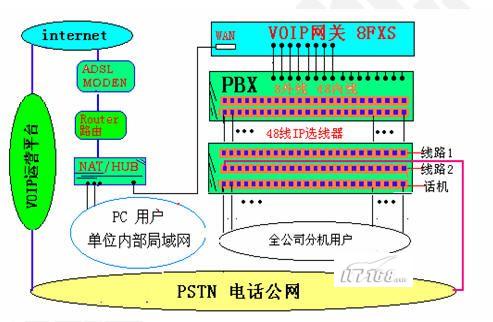 如果現(xiàn)有網絡接入方式為ADSL寬帶撥號上網,全公司共享上網使用,如果想要支持超過4人以上同時通話,為了使數(shù)據(jù)和語音互相不爭用帶寬,必須考慮另外申請一條ADSL。下圖為PBX、VOIP、選路器接線圖:
