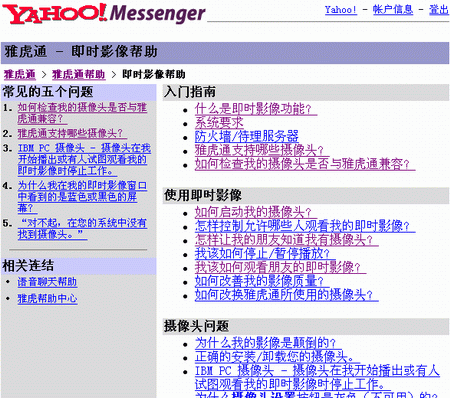 選擇工具->開啟我的攝像頭后,就會彈出“我的即時影像”窗口(圖4),如果你的攝像頭安裝連接正常,可以馬上從這個窗口中看到你的影像;如果你的攝像頭正常,但在窗口中卻沒有看到影像,你可以在聯(lián)網(wǎng)的情況下選擇當(dāng)前窗口中的幫助->即時影像幫助進入相關(guān)網(wǎng)頁(圖5)對你的攝像頭進行雅虎通的兼容性測試,或者尋求更為詳細的幫助。