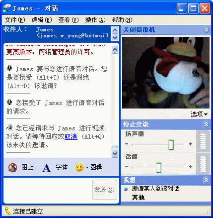 單擊對話框右邊的“啟動攝像機”和“開始交談”,系統(tǒng)會提示你正在等待對方回應(yīng)視頻或語音對話的邀請,對方接受,就開始進行視頻通話(見圖11)。如果雙方都有攝像頭,你還可以通過視頻框下面的“選項”將自己的影像設(shè)為畫中畫的功能。