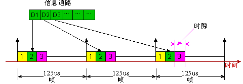 TDM就是時分復用模式。它把若干不同通道(Channel)的數(shù)據(jù)按照固定位置分配時隙(TimeSlot:8Bit數(shù)據(jù))合在一定速率的通路(Path)上。每一個時隙的速率為一個標準的PCM(Pulse-Code-Modulation)話路64Kbps。每通道時隙的重復頻率為Ts=8KHz,即幀周期為125us。如圖2所示。通常把若干通話復用在一起以后的通路組稱為一個基本群路,然后更大的通路均在此基礎(chǔ)上進一步復用(4倍)為高次群。其中的時隙數(shù)即復用的通道數(shù)與時鐘有關(guān)。國際上有兩個不同的基群標準(PRI:Primary Rate Interface)。美國和日本采用24支路標準,我國采用歐洲標準,使用32路標準,分別記為: