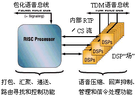 圖2畫出了第一代VoP網(wǎng)關(guān)典型的基于處理器的實(shí)現(xiàn)框圖,圖中利用通用DSP"場"來實(shí)現(xiàn)所有具體的DSP功能,利用通用RISC處理器來打包、匯聚和分發(fā)/路由尋找。(請參看補(bǔ)充材料<VoP技術(shù)>一文)。