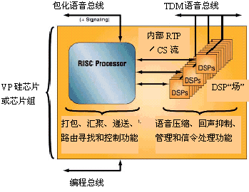 這種新型半導(dǎo)體元件被叫作語音處理器(VP),它不是技術(shù)創(chuàng)新成果,而只是傳統(tǒng)DSP核心和通用RISC處理器在一個(gè)或兩個(gè)硅片上的重新包裝和集成。DSP核心完成VoP的壓縮、回聲抑制和各種信號處理任務(wù),而RISC處理器完成VoP的匯聚和打包處理。