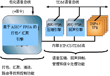 圖5畫出了這種技術(shù)實(shí)現(xiàn)的VoP系統(tǒng)框圖。圖中專用ASIC/FPGA引擎提供打包、匯聚、壓縮和回聲抑制功能。而DSP則用于信令功能,如音頻信號的接收和生成,DSP還用于開發(fā)商自定義功能。