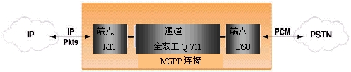 MSPP通道可以是全雙工語(yǔ)音編碼器、傳真轉(zhuǎn)發(fā)編碼器、或者是各種單工通道。在一個(gè)普通VoIP網(wǎng)關(guān)應(yīng)用中,一個(gè)端點(diǎn)就是一個(gè)和PSTN連接的DS0,PSTN連接最常見的是CG6000系列平臺(tái)上的T1或E1接口,也可能是T3接口。其它連接是一個(gè)通過以太網(wǎng)接口連接到廣域包網(wǎng)絡(luò)(WAN)的RTP話音包端口。通過指定端點(diǎn)和通道類型,很容易開發(fā)出各種包電話應(yīng)用。
