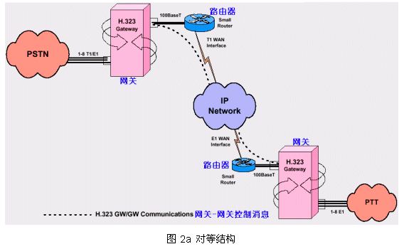 從PSTN來的呼叫被H.323網(wǎng)關(guān)受理,把其中的話音流轉(zhuǎn)換成IP數(shù)據(jù)包經(jīng)過IP網(wǎng)絡(luò)傳到目的網(wǎng)關(guān)下的指定電話終端;同時(shí)受理IP網(wǎng)絡(luò)來的呼叫(可以來自電腦終端或另一個(gè)PTT網(wǎng)絡(luò))轉(zhuǎn)向PSTN目的終端1。