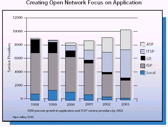 關(guān)于新的業(yè)務(wù)提供商的前景,ASP是最為熱門的,由于整個(gè)行業(yè)的外購趨勢,使得它吸引了數(shù)目巨大的風(fēng)險(xiǎn)債券和投資。但是如果說他們只是關(guān)注外購那就太籠統(tǒng)了。事實(shí)上一些公司是以托管為中心的,一些是以連通性為中心的,還有一些是以應(yīng)用為中心的。