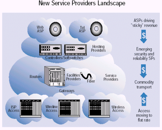 任何一個(gè)網(wǎng)絡(luò)的核心都是光纜和讓網(wǎng)絡(luò)工作起來的底層交換設(shè)備。傳統(tǒng)的業(yè)務(wù)提供商就是那些擁有這種底層設(shè)備的公司。但是打破傳統(tǒng)的語音環(huán)境為那些沒有這些底層設(shè)備的組織打開了向商業(yè)客戶和消費(fèi)者提供服務(wù)的大門。這種趨勢--網(wǎng)絡(luò)傳輸從電路交換轉(zhuǎn)變?yōu)榉纸M交換以及隨時(shí)可得的基于開放部件的劃算的業(yè)務(wù)平臺--使得這些新的業(yè)務(wù)提供商為自己的業(yè)務(wù)找到了商業(yè)機(jī)遇。